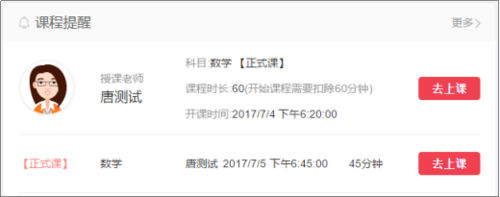 1.從首頁(yè)直接進(jìn)入。首頁(yè)的課程提醒版塊會(huì)顯示所有已排的課程,點(diǎn)擊“去上課”即可進(jìn)入該節(jié)課的課堂