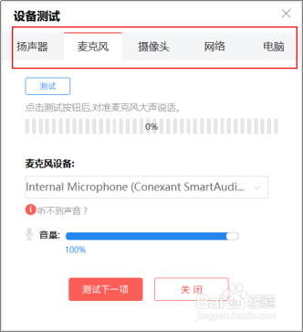 2.設(shè)備測(cè)試在您首次上課前會(huì)自動(dòng)彈出,測(cè)試項(xiàng)包括揚(yáng)聲器、麥克風(fēng)等5項(xiàng),請(qǐng)按照頁(yè)面提示依次完成所有項(xiàng)的測(cè)試,測(cè)試結(jié)果均沒有異常,即可正常上課。