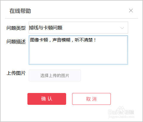 2.點(diǎn)擊“在線幫助”即彈出問題編輯框,依次選擇問題類型、輸入問題描述,如有必要還可以上傳問題界面的圖片,最后點(diǎn)擊“確認(rèn)”即可提交申請(qǐng),技術(shù)支持人員會(huì)在接到申請(qǐng)的第一時(shí)間與您聯(lián)系,幫您處理您所遇到的問題。