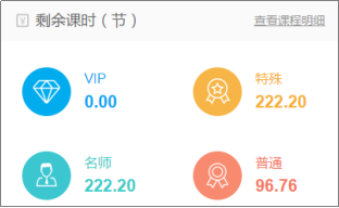 方式一:在客戶端首頁(yè),可以查看當(dāng)前剩余的課時(shí)數(shù)量,點(diǎn)擊“查看課程明細(xì)”即可進(jìn)入詳細(xì)的課時(shí)消費(fèi)記錄頁(yè)面;