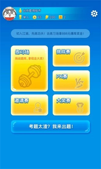 泡椒答題為游戲玩家提供了多種答題玩法:1)、練習(xí)場(chǎng):供用戶進(jìn)行答題練習(xí)、修煉等級(jí),獲取爆庫(kù)(答完題庫(kù))現(xiàn)金大獎(jiǎng);