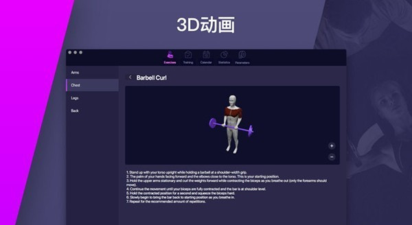 腿、手臂、肩部或腹部,一個龐大的數(shù)據(jù)庫為你身體每一部分的大量練習(xí)。每個動作都有詳細(xì)的描述和執(zhí)行時正確的身體位置三維動畫不要害怕,從專業(yè)人士的解釋開始正確地做這件事。