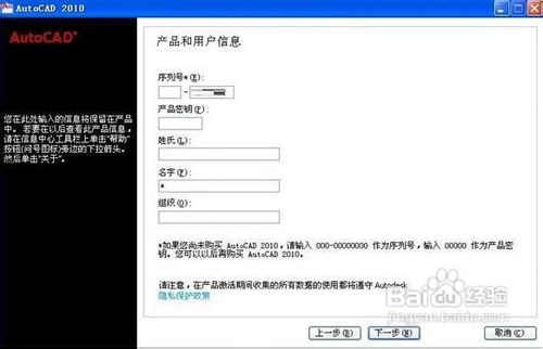 3、接下來(lái)要輸入產(chǎn)品SN號(hào)和KEY,輸入正確后點(diǎn)擊“下一步”按鈕即可:(序列號(hào)可隨意填寫(xiě),反正后面還會(huì)重新填寫(xiě)一次)
