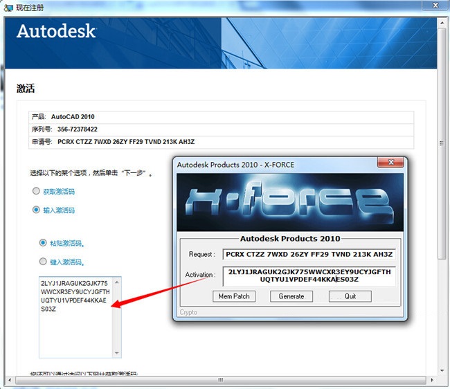 5、然后復(fù)制申請(qǐng)?zhí)柕絚ad2010注冊(cè)機(jī)上面計(jì)算激活碼,把運(yùn)算好的激活碼粘貼到左下角的激活碼填寫(xiě)處,點(diǎn)擊激活。