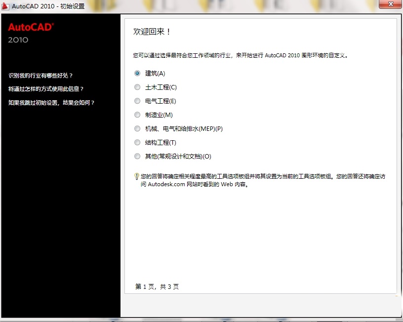 1、打開(kāi)已經(jīng)安裝好的CAD2010,在桌面上雙擊圖標(biāo)即可,根據(jù)大家自己所需要使用的行業(yè)進(jìn)行設(shè)置也可以跳過(guò)。