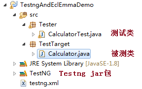 項(xiàng)目中使用TestNG測試框架,包含被測類'Calculator'和測試類'CalculatorTest'。