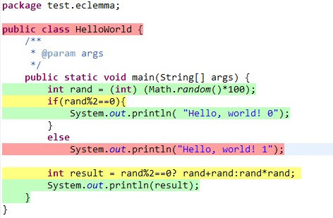 使用Coverage As運(yùn)行的代碼:綠色標(biāo)記表示該行語句完全執(zhí)行,黃色標(biāo)記表示該行語句部分執(zhí)行,紅色標(biāo)記表示該行語句沒有執(zhí)行到。