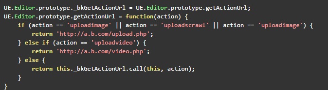ueditor 1.4.2+ 推薦使用唯一的請求地址,通過GET參數(shù)action指定不同請求類型。 但很多用戶都希望使用自己寫好的上傳地址,下面提供一種解決方法: 由于所有ueditor請求都通過editor對象的getActionUrl方法獲取請求地址,可以直接通過復(fù)寫這個方法實現(xiàn),例子如下: