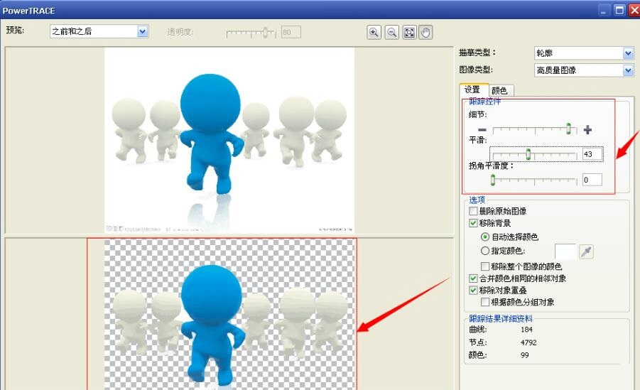 2、執(zhí)行:位圖——輪廓臨摹——高質(zhì)量圖形,系統(tǒng)會自動對圖片進(jìn)行臨摹,在右側(cè)的跟蹤控件下方可以調(diào)整臨摹的細(xì)節(jié),在原圖的下方可以看到臨摹后的預(yù)覽圖,調(diào)整滿意后點(diǎn)擊確定即可;