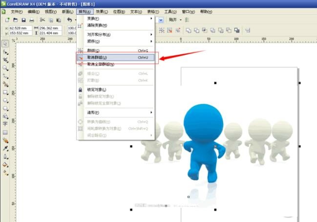 3、使用Ctrl+A鍵全選圖形,執(zhí)行:排列——取消群組,將臨摹后的圖形打撒,使其成為一個個單獨(dú)的圖形;