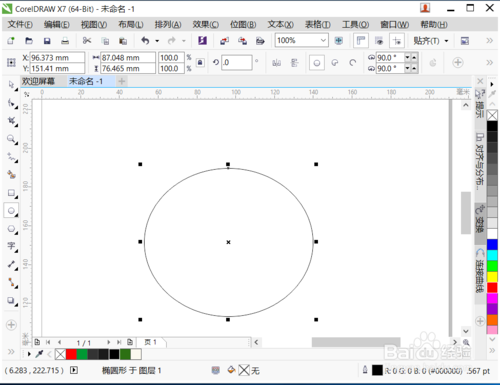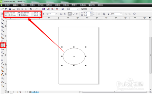 4、當(dāng)我們使用橢圓形隨意在頁面上繪制一個橢圓形,頁面上方的那些寬高數(shù)值不是頁面的大小數(shù)值,而是當(dāng)時的橢圓形的尺寸大小。因?yàn)?,要修改既定的頁面尺寸的大小,必須注意在使用“選擇工具”的前提下再進(jìn)行修改。