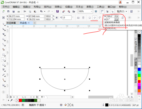 2、選擇屬性欄餅圖工具,設(shè)置角度180度到0度