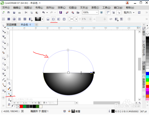 3、選擇交互式填充工具,選擇橢圓漸變填充,調(diào)整橢圓填充虛線框適合第一個橢圓邊