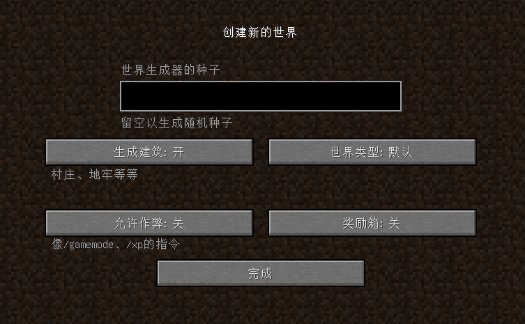 在選擇創(chuàng)建一個(gè)新的世界之后,會(huì)隨機(jī)生成一段代碼,之后所有世界內(nèi)地形的生成都會(huì)基于這段代碼,而這段代碼就是種子(Seed)。Beta1.3版之后,作者在地圖創(chuàng)建時(shí)增加了自定義種子代碼的輸入框,使我們能通過輸入特定種子代碼來(lái)生成特定的世界環(huán)境,見下圖: