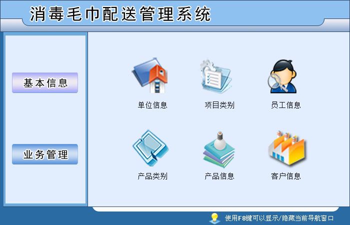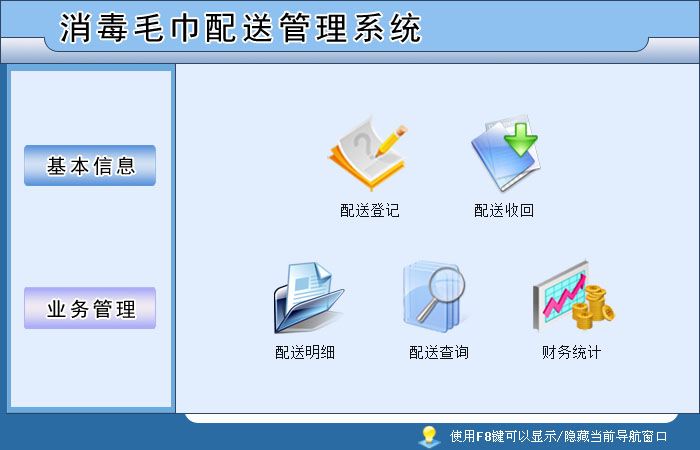 《消毒毛巾配送管理系統(tǒng)》是一款適用于向各種理發(fā)店、賓館、酒店配送消毒毛巾行業(yè)的一款軟件,軟件集配送、收回、統(tǒng)計(jì)與一體。軟件界面設(shè)計(jì)簡(jiǎn)潔、美觀其人性化的管理可以使用戶輕易上手,大大節(jié)省工作時(shí)間,提高工作效率??茖W(xué)的管理方法會(huì)給您帶來(lái)無(wú)限的效益,消毒毛巾配送管理系統(tǒng)將是您明智的選擇。 《消毒毛巾配送管理系統(tǒng)》包括如下功能模塊: 基本信息:?jiǎn)挝恍畔?、?xiàng)目類別、員工信息、產(chǎn)品類別、產(chǎn)品信息、客戶信息 業(yè)務(wù)管理:配送登記、配送收回、配送明細(xì)、配送查詢、財(cái)務(wù)統(tǒng)計(jì)