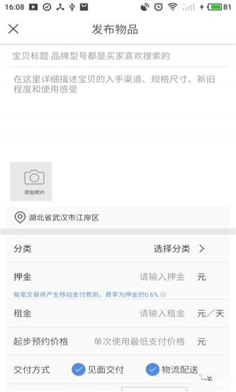 資源照片上傳、添加資源描述文字、資源分類。設(shè)置押金、租金、租期。在地圖上標(biāo)注資源地點(diǎn).