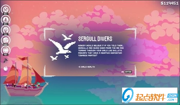 《不要下沉(Don't Sink)》是Sebastian Nigro, Christopher Anselmo, Daniel Marques制作的一款2D像素風格的角色扮演游戲。在游戲中,玩家將扮演一名船長,在大海上航行,你會遇到各種危險和突發(fā)事件,你必須要保證自己的船能在海上正常航行。【游戲玩法】