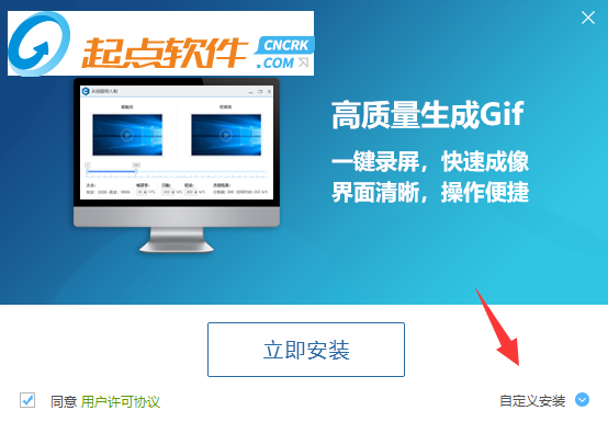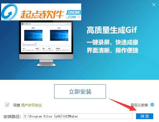 1、在起點(diǎn)軟件園下載好文件包,解壓之雙擊“GIFMaker.exe”主程序運(yùn)行,點(diǎn)擊“自定義安裝”可選擇安裝路徑。