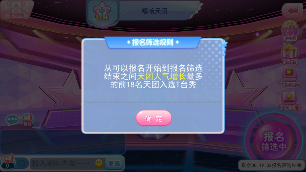 從報(bào)名開始起至報(bào)名結(jié)束,天團(tuán)人氣增長最多的前18個(gè)天團(tuán)。通過點(diǎn)贊提升天團(tuán)人氣值將更有機(jī)會得到T臺演出機(jī)會!