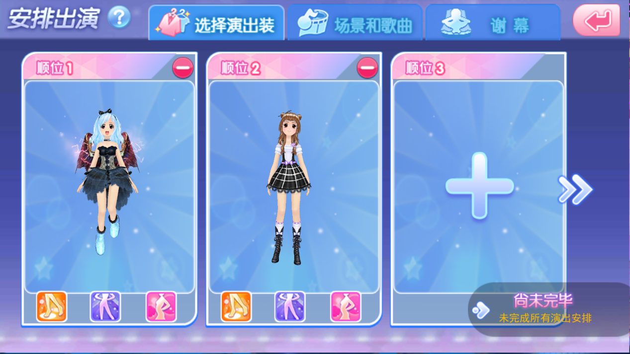 2,安排出演,必須安排8名演出名單,可以是同一人;4首背景歌曲;1個(gè)場景及謝幕展示。團(tuán)長選擇完成后下方提示會變成排練完畢,點(diǎn)擊后天團(tuán)成員即可查看本場秀的安排情況直到秀開始。