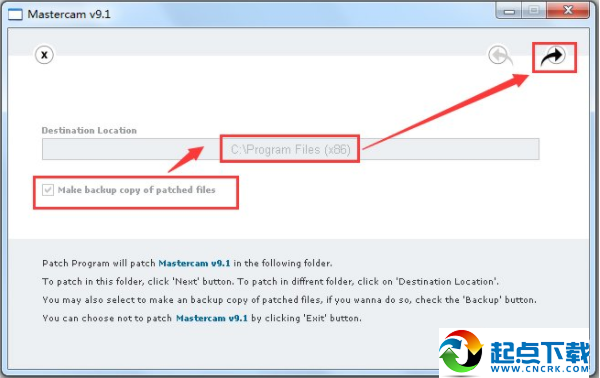 6.選擇好mastercam9.1的安裝路徑,然后把 make backup cope of patched files前面的對勾打上,然后點(diǎn)擊下一步