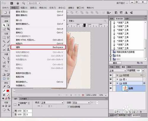 在編輯菜單中選擇“清除”,即可刪除背景,也可直接使用“Delete鍵”刪除