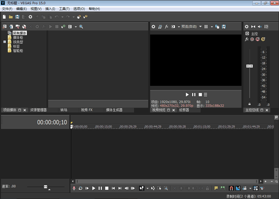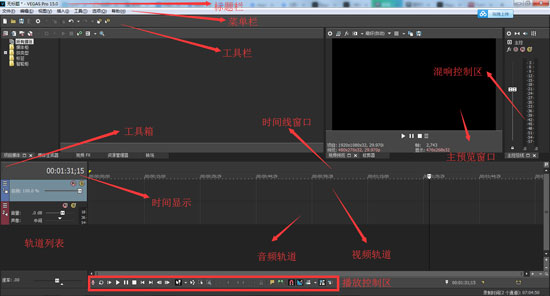 Vegas Pro啟動(dòng)后,Vegas Pro 15的“軟件操作界面”將會(huì)呈現(xiàn),Vegas Pro 15主界面是“工作和編輯項(xiàng)目”最主要的地方,根據(jù)功能的不同,工作界面被分成幾個(gè)區(qū)域。