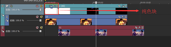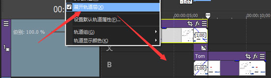 展開(kāi)軌道層后,發(fā)現(xiàn)在同一軌道的兩段素材被分列在同一軌道的兩個(gè)不同的層中,中間會(huì)多一個(gè)帶有交叉符號(hào)的軌道,帶有交叉符號(hào)的軌道是添加“轉(zhuǎn)場(chǎng)”FX的地方。當(dāng)兩段素材沒(méi)有發(fā)生交叉時(shí),素材將會(huì)按照一上一下的順序,依次排列,如圖所示。
