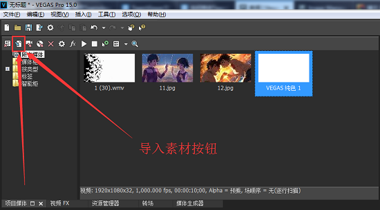 雙擊打開(kāi)Vegas Pro專(zhuān)業(yè)版視頻剪輯軟件,點(diǎn)擊左上角的導(dǎo)入素材按鈕,將需要的素材導(dǎo)入到項(xiàng)目媒體中,如下圖所示。