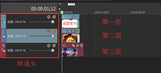 將素材拖動(dòng)到下方時(shí)間線上,放置的位置為:最上層軌道為遮罩素材、下面兩條軌道為圖片或視頻素材。具體如下圖所示。