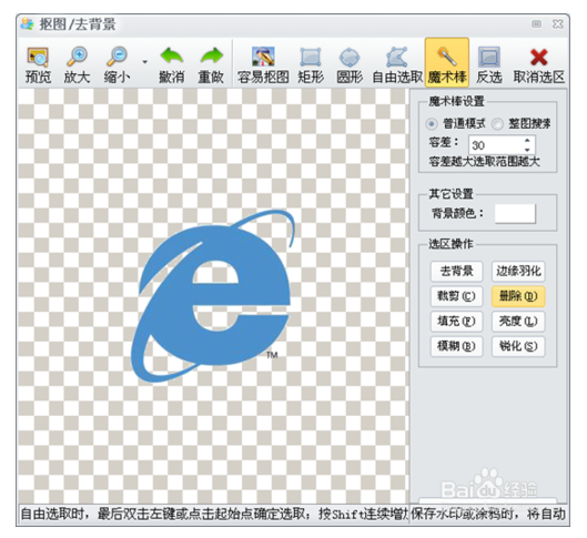 以上介紹的使用魔法棒摳圖,一般是紋路比較清晰的圖片。但是對(duì)于很多圖片,我們可能選取不能一次處理好,可以通過(guò)放大圖片,和自由選取,多邊形選取來(lái)配合使用摳圖