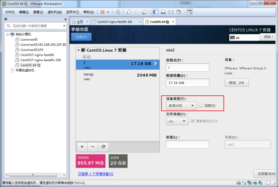 選擇上圖所示:自動分區(qū)完成。注意:我們在選擇分區(qū)的時候,設(shè)備類型一定要選擇標(biāo)準(zhǔn)分區(qū),如圖示: