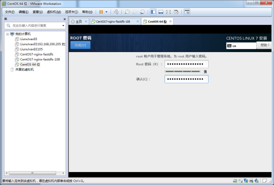 這里centos7設(shè)置密碼需要數(shù)字、字母加特殊符號,它才不會報警告!點擊完成就設(shè)置好root用戶密碼了。