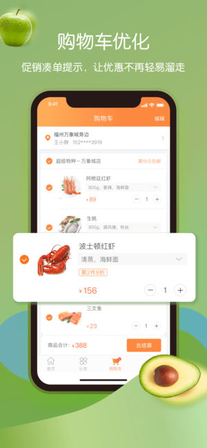 3、集優(yōu)選水果、時令鮮蔬、禽魚肉類等數(shù)十種商品分類、海量商品任您挑選。