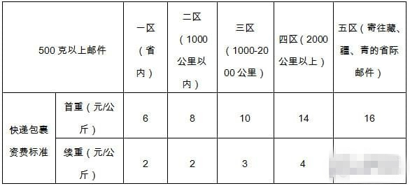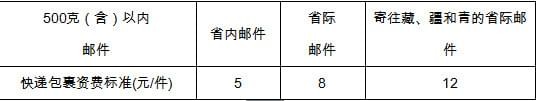 (1)單件重量500克(含)以內(nèi)省內(nèi)5元/件,省際8元/件,寄往西藏、青海和新疆省(自治區(qū))的省際郵件12元/件。