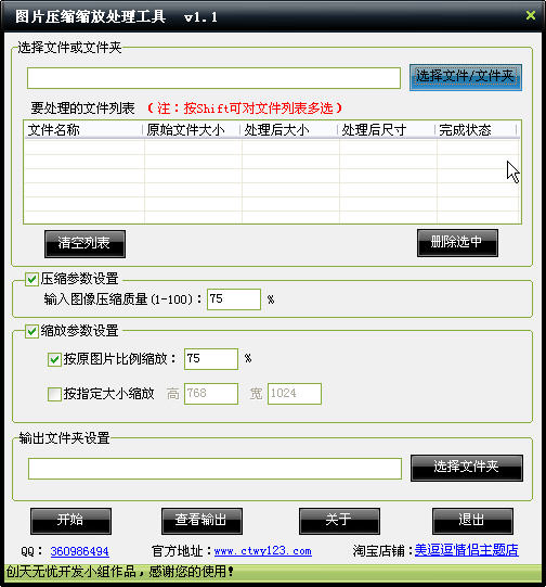 圖片壓縮縮放處理工具是一款綠色小巧的壓縮圖片文件占用空間大小,縮放圖片尺寸的實用小工具。盡心的界面設計使操作更簡單,不用學習,直接使用,本程序為綠色程序,可以任意復制,不用安裝,可直接運行。批量壓縮圖片體積、批量縮小圖片尺寸的軟件,支持拖放操作,按住Shift鍵將圖片全部拖到軟件界面里,選擇好要縮小的百分比和尺寸大小,點擊“開始”即可開始轉換。