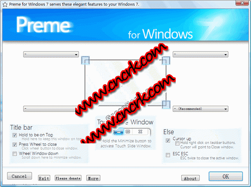 Preme for Windows7 0.94.3 英文綠色免費版 preme是一個神奇的windows7桌面增強工具,它可以讓桌面的四個角落實現(xiàn)不同的功能。比如你可以定義,當(dāng)鼠標(biāo)指針指向桌面右上角時隱藏所有活動窗口、而左上角實現(xiàn)3d程序切換程序的功能。當(dāng)然preme的神奇之處遠(yuǎn)不止這些,待看完軟件盒子對preme的介紹后,你會覺得preme讓windows7的操作變得更炫、更簡單、更快捷