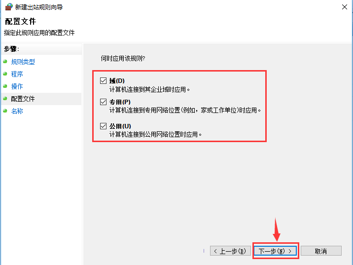 這一步我們將“域”、“專用”、“公用”全部勾選,然后“下一步”,