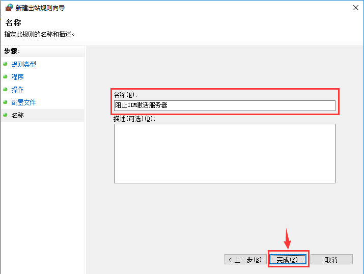 這一步我們給剛剛建立的防火墻規(guī)則起一個(gè)名字,比如“阻止IDM激活服務(wù)器”,描述里不用填寫,然后點(diǎn)擊完成。