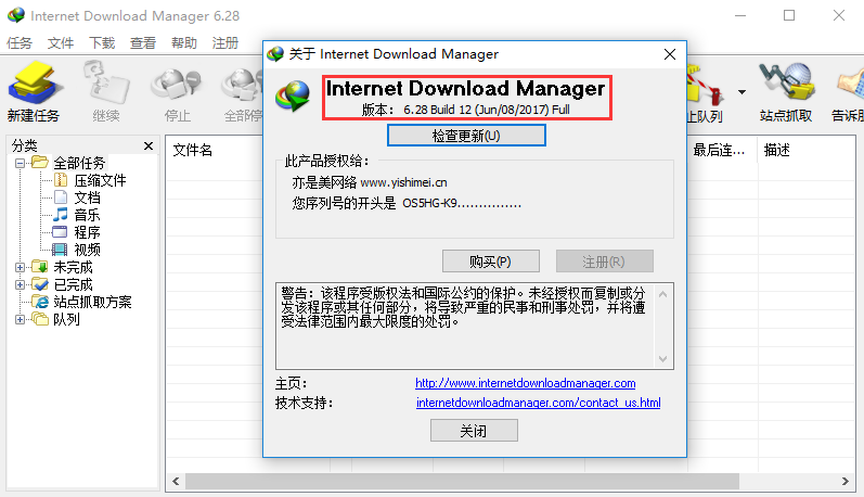 我們可以看到IDM版本:6.28Build 12(Jun/08/2017)Full,這表明已經(jīng)成功注冊(cè)激活,其中的日期(Jun/08/2017)為IDM6.28Build 12的發(fā)布日期。