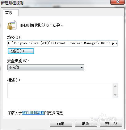點(diǎn)擊瀏覽,選擇您Internet Download Manager根目錄的IDMGrHlp.exe,確定,將安全級(jí)別調(diào)整為不允許,點(diǎn)擊應(yīng)用-確定