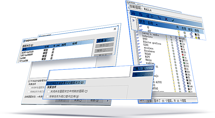 圖層屬性管理器中的,顯示了圖層及其性質(zhì),可以添加、刪除和重命名圖層,更改其屬性,為布局設(shè)置屬性重寫視口,或添加描述層和實(shí)時(shí)應(yīng)用的變化。