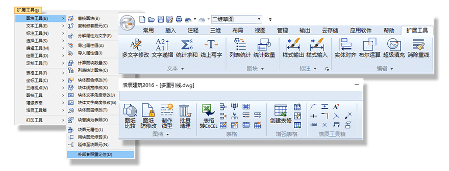 浩辰CAD還支持帶主菜單的Ribbon界面,用戶可以通過主菜單調(diào)用一些Ribbon界面下沒有的非常用功能。