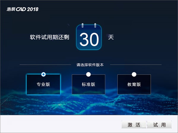 3、成功破解后,打開浩辰cad2018軟件,彈出366天的試用期,專業(yè)版、標(biāo)準(zhǔn)版和教育版都可以使用。
