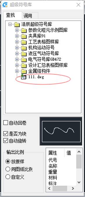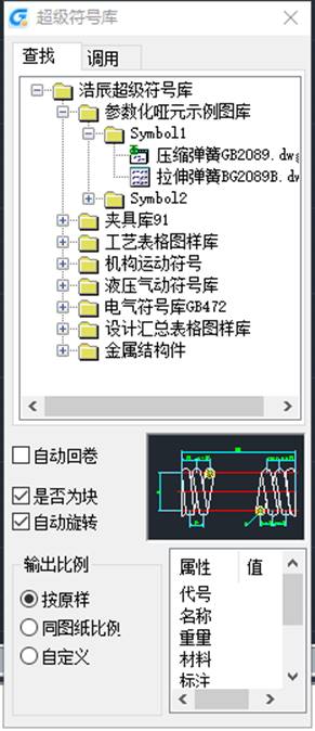 從菜單或工具條中選擇要調(diào)用的符號庫,出現(xiàn)“超級符號庫”對話框。通過點(diǎn)取“調(diào)用”,或者雙擊要調(diào)用的符號的節(jié)點(diǎn),可以在圖1和圖2對話框來回切換。選擇好合適的輸出比例,將鼠標(biāo)指向要調(diào)用的符號節(jié)點(diǎn)或圖片后按下鼠標(biāo)左鍵,出現(xiàn)一握緊的手形光標(biāo)及一矩形虛框后,按下左鍵不放,直至拖動到圖形區(qū)后松開。