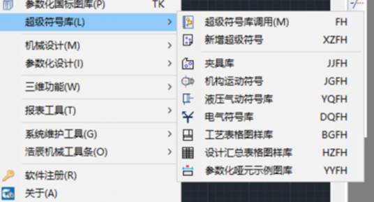 符號調(diào)用實(shí)現(xiàn)對符號圖形的顯示和拖動插入。下圖是浩辰CAD機(jī)械軟件中符號調(diào)用的菜單具條,可以快捷地調(diào)用。