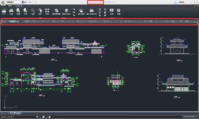 一般窗口查看:打開的多張圖紙的圖紙名稱都顯示在上方,想要看哪一張點(diǎn)擊圖紙名稱即可查看,如圖所示: