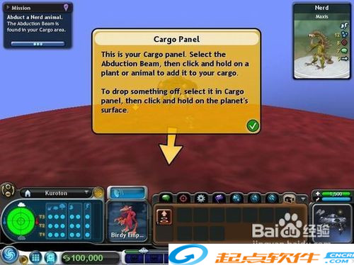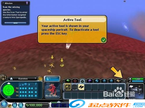 探索失落物種。下方的工具欄中,雷達(dá)是一個(gè)重要道具,一般情況下不需要將其關(guān)閉,它會(huì)自動(dòng)探索任務(wù)關(guān)鍵對(duì)象并在飛船下方指出正確方向,且前期能在目標(biāo)對(duì)象頭上以箭頭顯示。同時(shí),如果飛船接近目標(biāo)的話,雷達(dá)的聲音也會(huì)變得急促。選中第三項(xiàng)的探索工具,用鼠標(biāo)左鍵點(diǎn)擊星球上的動(dòng)植物進(jìn)行探索。