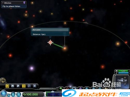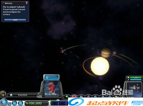 通過收集按鈕(黃色箭頭所指示的)可以查看自己的任務(wù)目標(biāo)以及勛章收集狀況。滑動(dòng)鼠標(biāo)滾輪使飛船飛向恒星系。飛向Calceall星球,用鼠標(biāo)左鍵點(diǎn)選該星球即可前往。