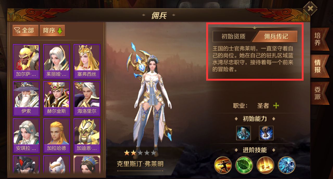 情報(bào)板塊用來瀏覽全部傭兵的信息,查看傭兵的初始資質(zhì)、職業(yè)、技能、能力等,已擁有的傭兵會(huì)標(biāo)明“擁有”。